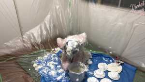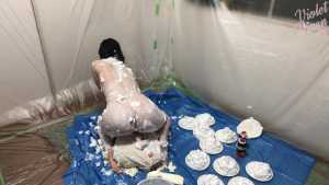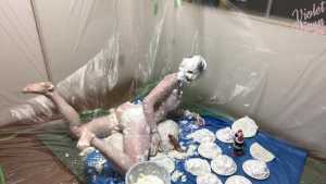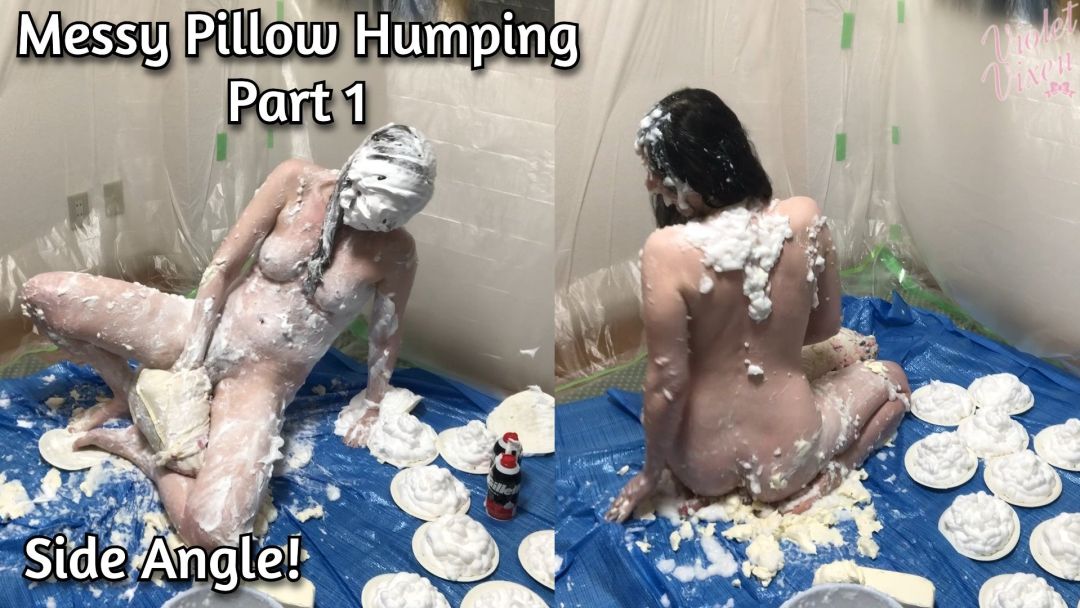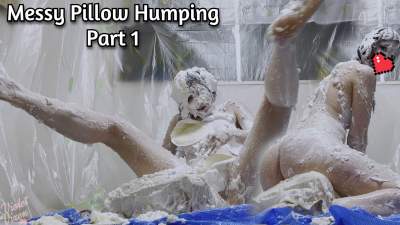 I start by putting a block of cream cheese on the pillow and trying to crush it with my ass and hairy pussy. Then I move on to some of the still warm white gunge, and find it impossible to resist a nice creamy shaving foam pie to my ass and face! I love the different textures from the cold semi-solid cream cheese which becomes more smearable and mixable the more I grind my hairy pussy over it, the warm thick gunge, and the sharp menthol chill from the soft, fluffy foam. There is also some head dunking into the gunge bucket, but it does not stick to my face as much as I hoped--not that it isn't messy lol. I also insert a realistic cock dildo into my pillow and rip a little hole for it to stick out. It's super slipper and hot. There are lots of posing as I get more and more covered in all white substances. From hands behind my back, lots of great ass shots, long legs spread, and more. It's also impossible to resist enjoying pies to the face and other face WAM because my face is so sensitive and it feels amazing while humping and grinding my pillow.